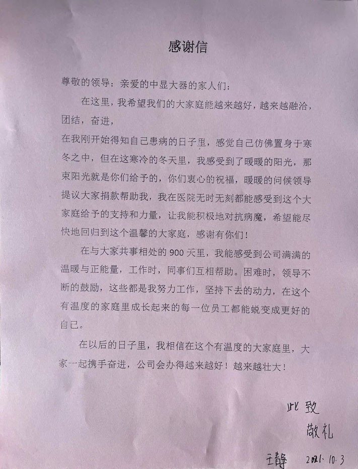 10月9日上午,中顯智能員工代表,攜鮮花、果籃和慰問金前往患病員工王靜家中看望,向她送去公司的關(guān)懷和溫暖。