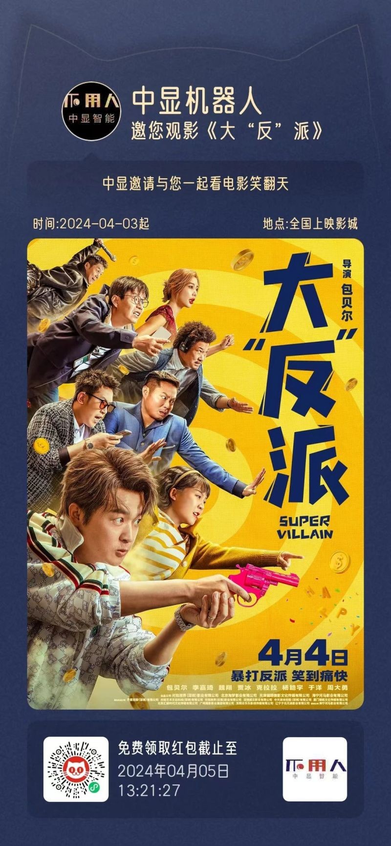 恰逢節假日的到來,為了讓大家的假期生活更加精彩,中顯智能機器人來給大家送福利了哦!我們將發放免費電影票30張。所有人都可以通過掃描海報二維碼來搶票哦!搶票時間截止到2024年4月5日下午13點21分,時間有限,數量有限,先到先得哦!!!